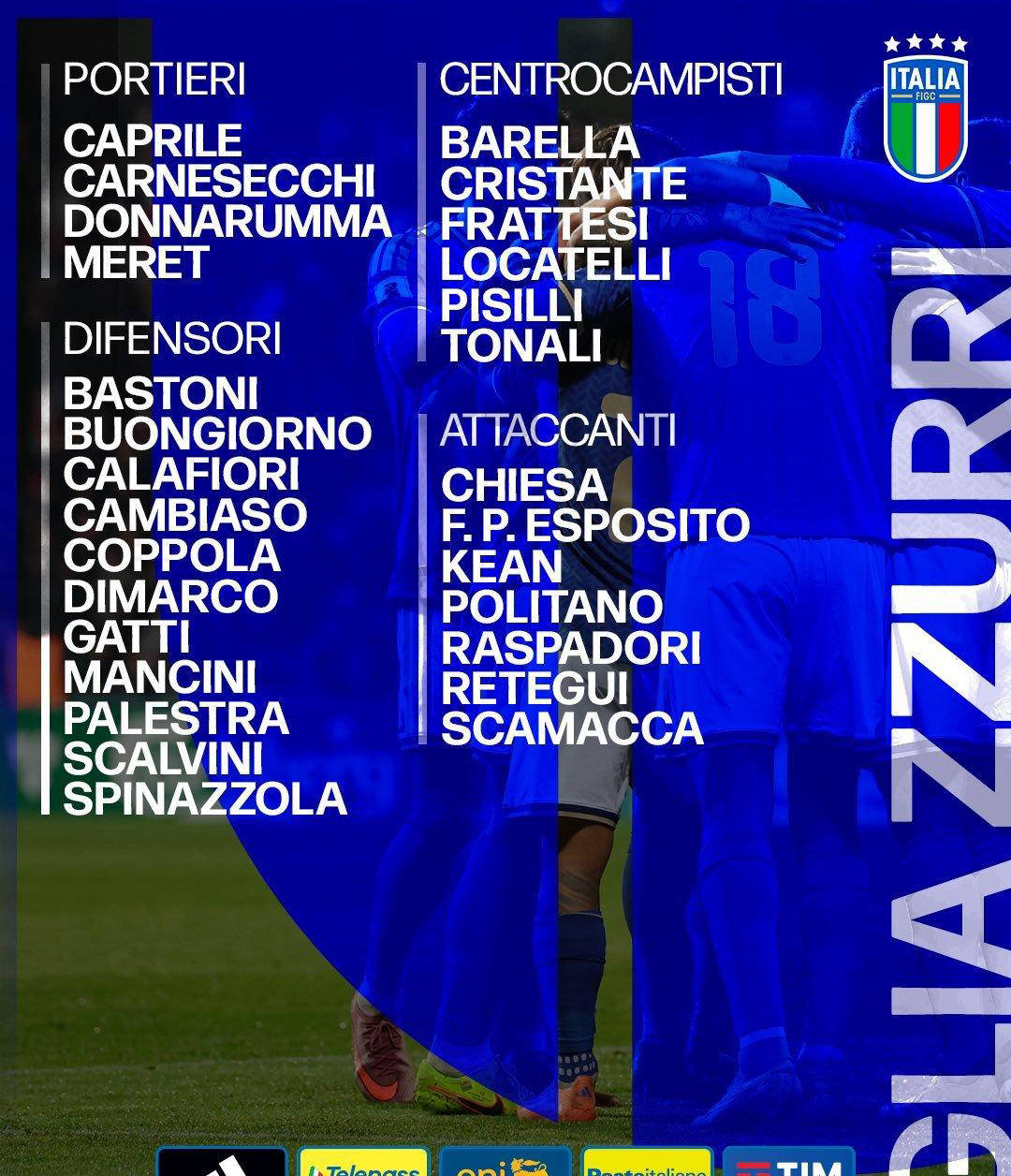 与此同时,意大利国家队近期公布了参加世界杯附加赛的新一期名单。托纳利、基耶萨、巴雷拉、多纳鲁马成为领军人物,另外皮奥·埃斯波西托和巴斯托尼也入选。北京时间3月27日凌晨3点45分,意大利将在世预赛欧洲区附加赛半决赛迎战北爱尔兰,胜者将继续争夺与威尔士或波黑的决赛名额。